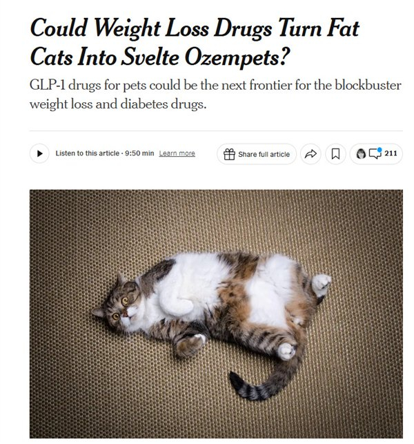 该药物不仅能够帮助超重宠物减肥,还可能为糖尿病、肾病等常见猫咪代谢疾病提供解决方案,有望提升猫咪生活质量、促进健康衰老,甚至可能成为 “对猫咪最具影响力的延寿疗法”之一