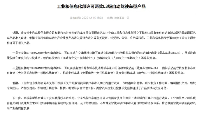 12月15日工业和信息化部官网消息,我国首批L3级有条件自动驾驶车型准入许可正式公布,分别为长安牌SC7000AAARBEV型纯电动轿车和极狐牌BJ7001A61NBEV型纯电动轿车。