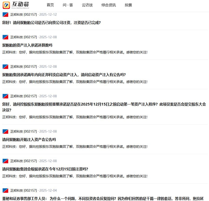 投资者对“双胞胎”履行承诺一事也十分关心,多次在投资者互动平台问及进展,甚至一天的四条问题都与此有关。正邦科技则表示,经向控股股东“双胞胎”了解,“双胞胎”会严格履行相关承诺。