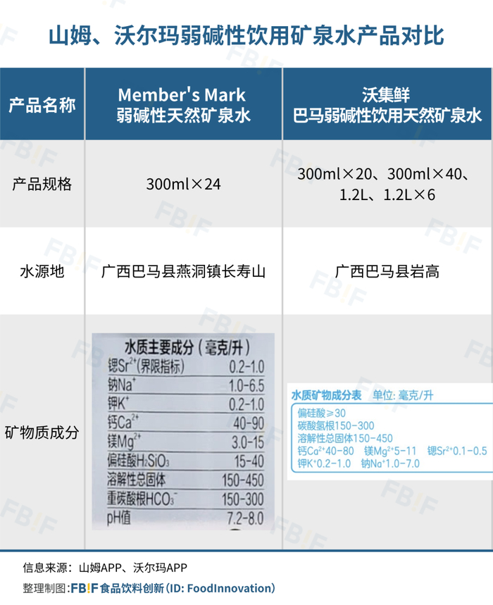 如今,在沃尔玛的货架上,也能看到与之相似的产品「沃集鲜巴马弱碱性饮用天然矿泉水」。