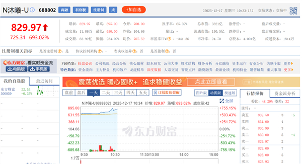 今天沐曦股份上市后股价持续走强,盘中拉升大涨超700%(目前股价是820元,盘中最高是895元。),总市值近3350亿元,超过摩尔线程。