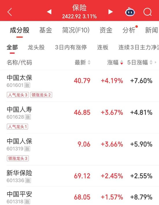 金融股午后走强,保险板块领涨,中国太保、中国人寿上涨;华泰证券盘中一度逼近涨停,收盘上涨6.09%。