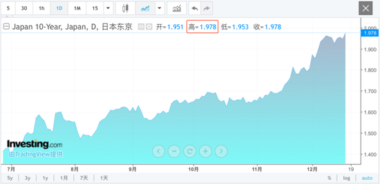 今日(12月17日),日本10年期国债收益率最高触及1.978%,创2007年6月来最高水平,接近近20年未曾突破的2%心理关口。有分析指出,日本10年期国债收益率持续走高的主要原因是,日本央行的加息预期持续升温。