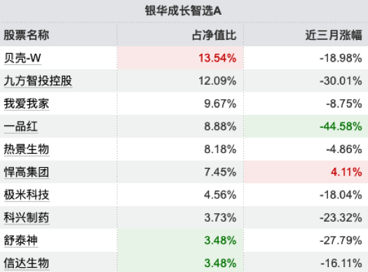 深入分析其持仓结构,基金经理王晓川构建了一个高度集中于地产产业链和医药生物的组合。其前两大重仓股贝壳-W和九方智投控股分别占比13.54%和12.09%,合计超过25%,然而这两只股票近三个月分别下跌18.98%和30.01%。