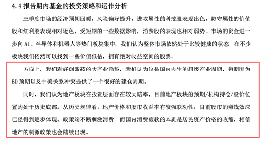 他特别强调了对创新药产业趋势的看好,认为这是“国内内生的超级产业周期”。同时,他认为“地产板块在投资层面存在较大赔率”,目前该板块的预期、机构持仓和股价均处于历史底部,相信相关政策刺激将陆续出台。
